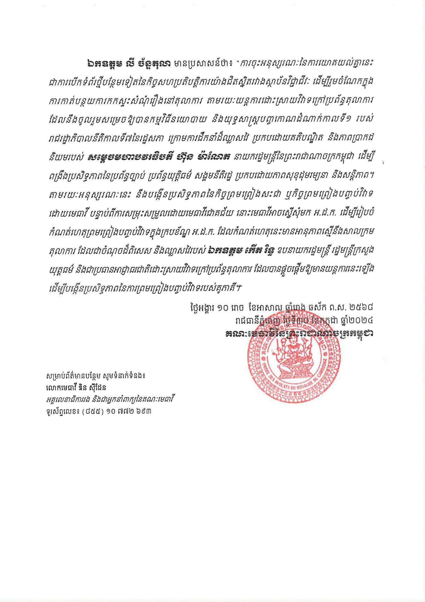 នាថ្ងៃអង្គារ ១០ រោច ខែអាសាឍ ឆ្នាំរោង ឆស័ក ព.ស. ២៥៦៨ ត្រូវនឹងថ្ងៃទី៣០ ខែកក្កដា ឆ្នាំ២០២៤ គណៈមេធាវីនៃព្រះរាជាណាចក្រកម្ពុជា និង អាជ្ញាធរជាតិដោះស្រាយវិវាទក្រៅប្រព័ន្ធតុលាការ បានបង្កើតកិច្ចសហប្រតិបត្តិការផ្លូវការ តាមរយៈការចុះអនុស្សរណៈនៃការយោគយល់គ្នា ស្តីពី៖ "កិច្ចសហប្រតិបត្តិការក្នុងការសម្រុះសម្រួលផ្សះផ្សាវិវាទក្រៅប្រព័ន្ធតុលាការនៅកម្ពុជា " ដោយ ឯកឧត្តម កើត រិទ្ធ ឧបនាយករដ្ឋមន្រ្តី រដ្ឋមន្រ្តីក្រសួងយុត្តធម៌ និងជាប្រធានអាជ្ញាធរជាតិ ដោះស្រាយវិវាទក្រៅប្រព័ន្ធតុលាការ និង ឯកឧត្តម លី ច័ន្ទតុលា ប្រធានគណៈមេធាវី នៃព្រះរាជាណាចក្រកម្ពុជា។ ការចុះហត្ថលេខាលើអនុស្សរណៈនៃការយោគយល់គ្នានេះ គោលបំណងបង្កើតកិច្ចសហប្រតិបត្តិការផ្លូវការក្នុងគោលបំណងលើកកម្ពស់គុណភាព ប្រសិទ្ធភាព និងភាពឆាប់រហ័សនៃ ការដោះស្រាយវិវាទ តាមរយៈការសម្រុះសម្រួលផ្សះផ្សាក្រៅប្រព័ន្ធតុលាការនៅកម្ពុជា។ តាមរយៈស្មារតីនៃកិច្ចសហប្រតិបត្តិនេះ អ.ដ.ក. នឹងសហការជាមួយគណៈមេធាវីនៃព្រះរាជាណាចក្រកម្ពុជា ដើម្បីចាត់ចែងនីតិវិធីបញ្ចប់ជាស្ថាពរនូវវិវាទ ដែលត្រូវបានសម្រុះសម្រួលផ្សះផ្សាបញ្ចប់ជូនប្រជាពលរដ្ឋដោយជោគជ័យ ដោយមេធាវី ពោលគឺ មេធាវីអាចយកវិវាទដែលខ្លួនបានសម្រុះសម្រួលផ្សះផ្សាបញ្ចប់ដោយជោគជ័យមកស្នើសុំឱ្យ អ.ដ.ក. ទទួលស្គាល់ និងរៀបចំផ្តល់ជាកំណត់ហេតុព្រមព្រៀងបញ្ចប់វិវាទ ដែលមានអានុភាពអនុវត្តដូចសេចក្តីសម្រេចស្ថាពររបស់តុលាការ ដូចករណីវិវាទដែលបានដោះស្រាយបញ្ចប់ក្នុងក្របខ័ណ្ឌ អ.ដ.ក. ផងដែរ។ ជាងនេះទៅទៀតស្ថាប័នទាំងពីរនឹងសហការ រៀបចំកិច្ចប្រជុំ សិក្ខាសាលា កម្មវិធីបណ្តុះបណ្តាល ឬព្រឹត្តិការណ៍នានាទាក់ទងនឹងយន្តការសម្រុះសម្រួលផ្សះផ្សាវិវាទក្រៅប្រព័ន្ធតុលាការជាពិសេសពង្រឹង និងលើកកម្ពស់ការផ្សព្វផ្សាយអំពីអត្ថប្រយោជន៍នៃការដោះស្រាយវិវាទ តាមរយៈការសម្រុះសម្រួលផ្សះផ្សាក្រៅប្រព័ន្ធតុលាការ ជូនសាធារណជន និងមេធាវីនៃព្រះរាជាណាចក្រកម្ពុជា។ ក្នុងឱកាសនោះដែរ ឯកឧត្តមប្រធាន បានបង្ហាញសេចក្តីសោមនស្សរីករាយ និងសូមថ្លែងអំណរគុណយ៉ាងជ្រាលជ្រៅជូនចំពោះ ឯកឧត្តម ឧបនាយករដ្ឋមន្រ្តី ដែលបានផ្តល់កិត្តិយស និងសេចក្តីទុកចិត្តដល់គណៈមេធាវី ដើម្បីក្លាយជាដៃគូសហការជាមួយអាជ្ញាធរជាតិដោះស្រាយវិវាទក្រៅប្រព័ន្ធតុលាការ ដើម្បីរួមចំណែកក្នុងការកាត់បន្ថយការកកស្ទះសំណុំរឿងនៅតុលាការ តាមរយៈយន្តការដោះស្រាយវិវាទក្រៅប្រព័ន្ធតុលាការ ដែលនឹងចូលរួមសម្រេចឱ្យបានកម្មវិធីនយោបាយ និងយុទ្ធសាស្រ្តបញ្ចកោណដំណាក់កាលទី១ របស់ រាជរដ្ឋាភិបាលនីតិកាលទី៧នៃរដ្ឋសភា ក្រោមការដឹកនាំដ៏ឈ្លាសវៃ ប្រកបដោយគតិបណ្ឌិត និងភាពប្រាកដនិយម