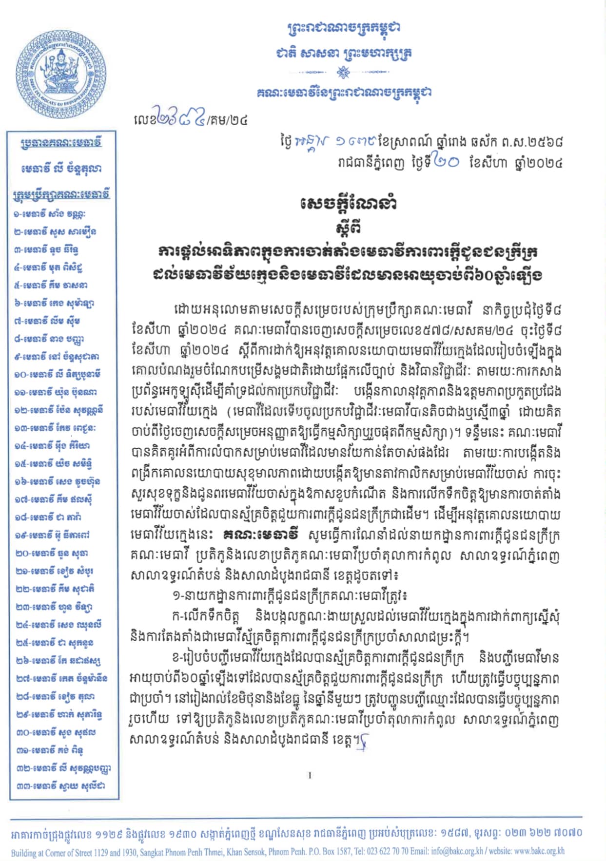 សេចក្តីណែនាំ ស្តីពី ការផ្តល់អាទិភាពក្នុងការចាត់តាំងមេធាវីការពារក្តីជូនជនក្រីក្រដល់មេធាវីវ័យក្មេងនិងមេធាវីដែលមានអាយុចាប់ពី៦០ឆ្នាំឡើង