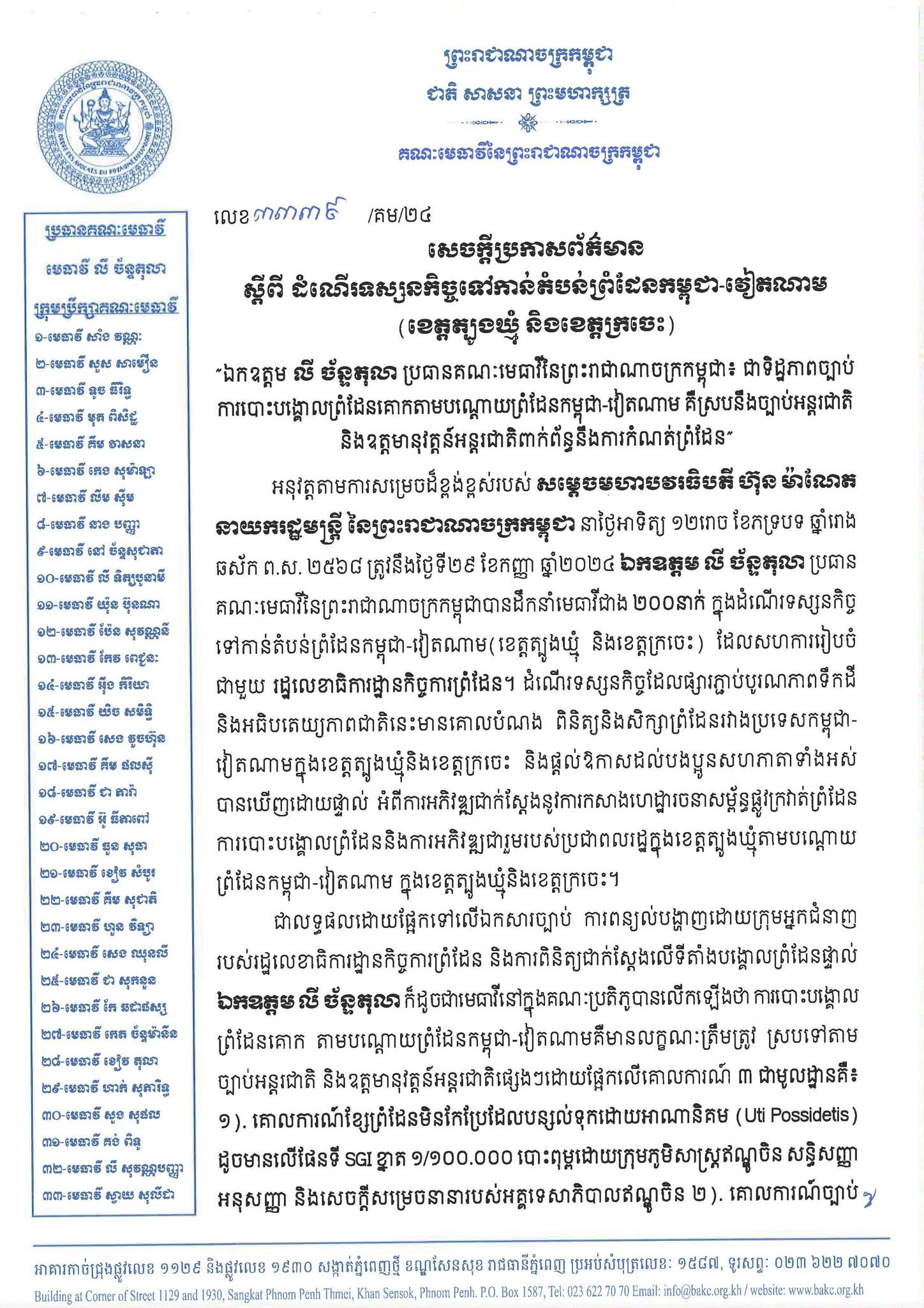 សេចក្តីប្រកាសព័ត៌មាន ស្តីពីដំណើរទស្សនកិច្ចទៅកាន់តំបន់ព្រំដែនកម្ពុជា-វៀតណាម (ខេត្តត្បូងឃ្មុំ និងខេត្តក្រចេះ)