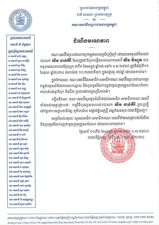 ដំណឹងមរណៈរបស់ឧបាសក យឹម ចាន់គីរី ដែលត្រូវជាឪពុកបង្កើតរបស់លោកមេធាវី យឹម វិស្សុត បានទទួលមរណភាពនៅថ្ងៃសុក្រ ៩កើត ខែអស្សុជ ឆ្នាំរោង ឆស័ក ព.ស.២៥៦៨ ត្រូវនឹងថ្ងៃទី១១ ខែតុលា ឆ្នាំ២០២៤ វេលាម៉ោង ១០:៣៧នាទីយប់ ក្នុងជន្មាយុ ៧៨ឆ្នាំ ដោយរោគាពាធ។