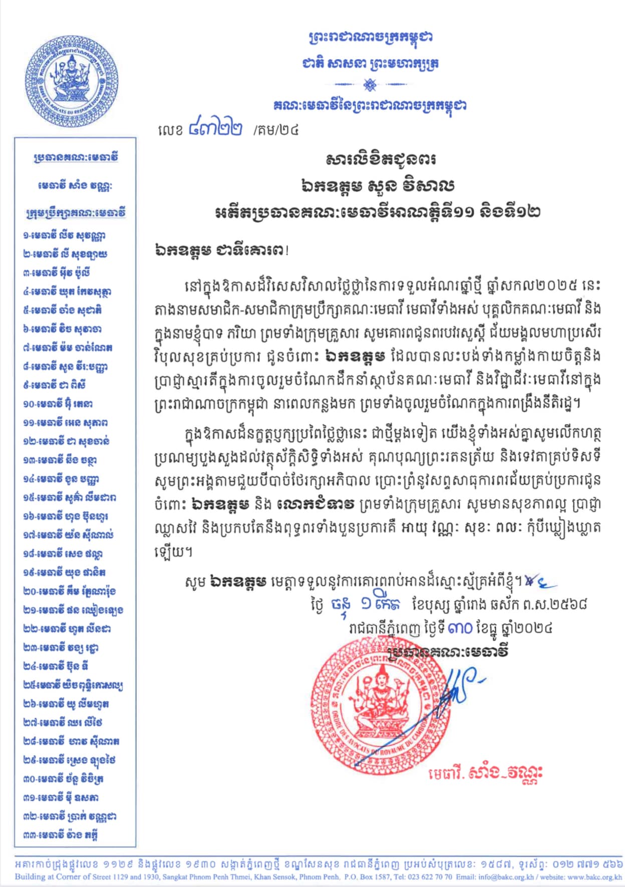 សារលិខិតជូនពរ ឯកឧត្តម សួន វិសាល អតីតប្រធានគណៈមេធាវីអាណត្តិទី១១ និងទី១២ នៅក្នុងឱកាសដ៏វិសេសវិសាលប្រសើរថ្លៃថ្លានៃការទទួលអំណរឆ្នាំថ្មី ឆ្នាំសកល ២០២៥