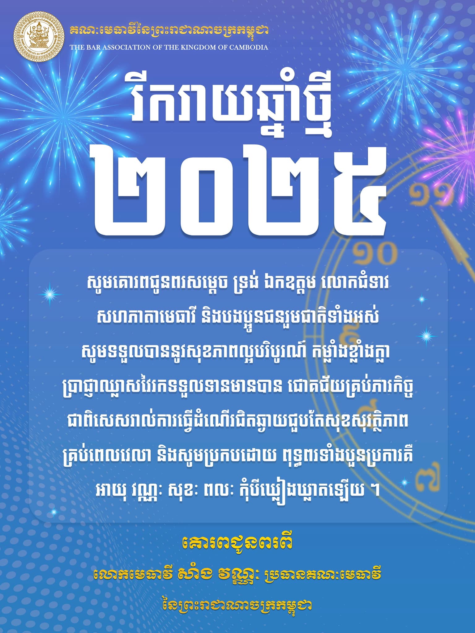 លោកមេធាវី សាំង វណ្ណៈ ប្រធានគណៈមេធាវីនៃព្រះរាជាណាចក្រកម្ពុជា សូមគោរពជូនពរសម្តេច ទ្រង់ ឯកឧត្តម លោកជំទាវ សហភាតាមេធាវី និងបងប្អូនជនរួមជាតិទាំងអស់ ក្នុងឱកាសចូលឆ្នាំថ្មី ឆ្នាំសកល ២០២៥