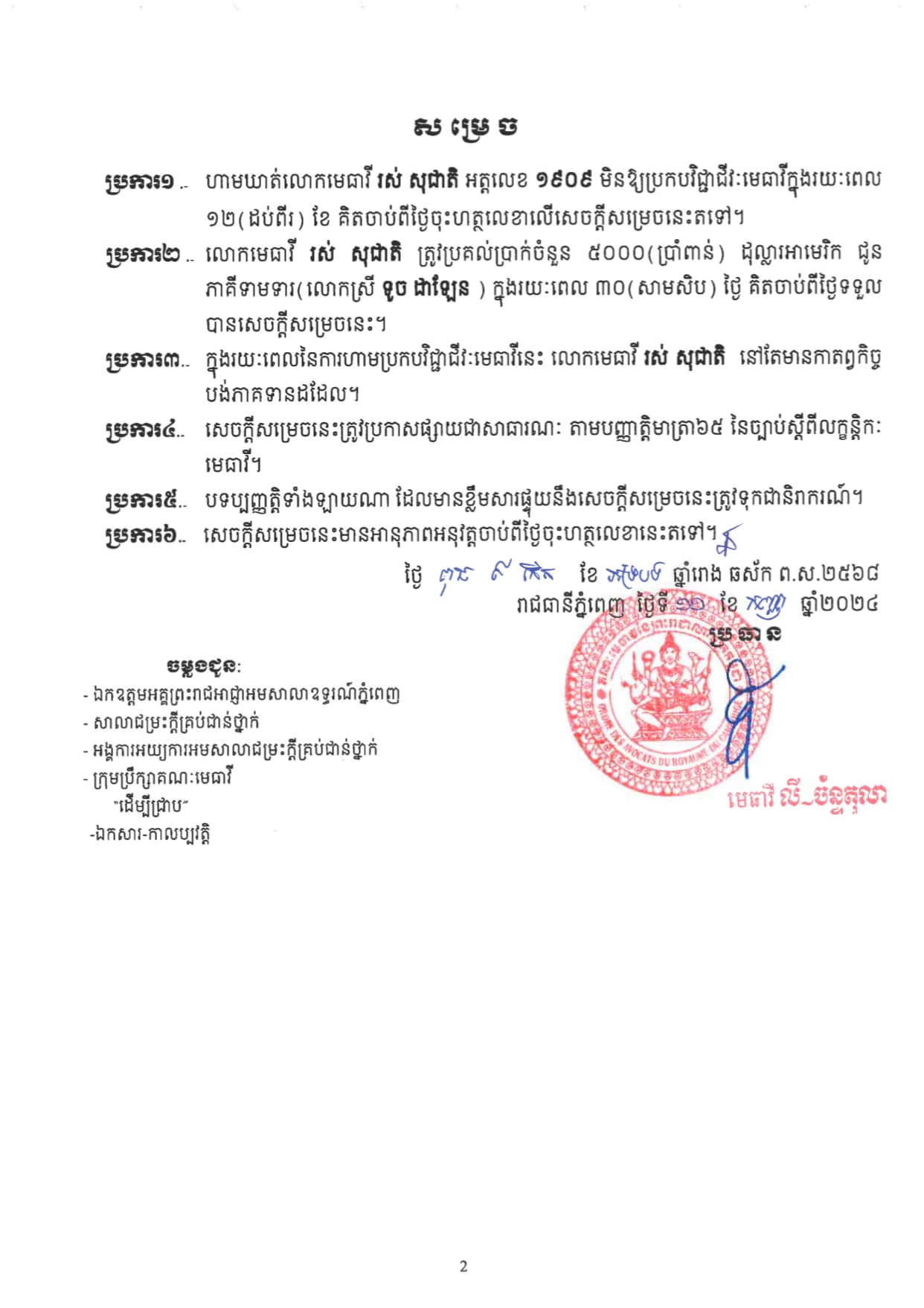 គណៈមេធាវីបានសម្រេចដាក់ទណ្ឌកម្មវិន័យលើលោកមេធាវី រស់ សុជាតិ អត្តលេខ ១៩០៩ ដោយហាមឃាត់មិនឱ្យប្រកបវិជ្ជាជីវៈមេធាវី ក្នុងរយៈពេល ១២(ដប់ពីរ) ខែ និងសម្រចឱ្យប្រកាសផ្សាយសេចក្ដីសម្រេចនេះជាសាធារណៈ